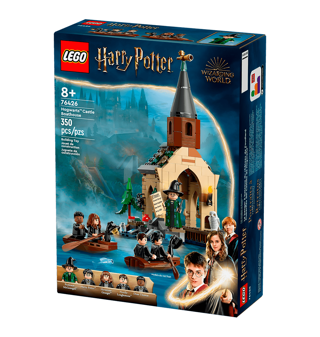 Incluye 2 botes, cada uno para 2 minifiguras, y un cobertizo con espacio en el interior para un bote, un escondite para Trevor, el sapo mascota de Neville Longbottom, y 1 cuadro de Hogwarts (de 14 posibles para coleccionar).