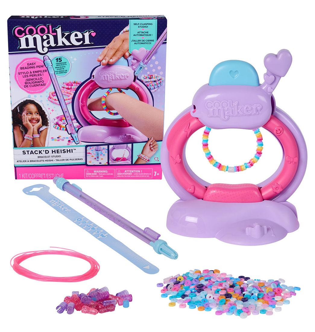 El estudio de brazaletes Heishi de Cool Maker permite a los niños crear pulseras elegantes con facilidad. Incluye más de 1200 cuentas coloridas, un bolígrafo para recoger cuentas y una guía de diseño. Ideal para fomentar la creatividad y el estilo personal.
