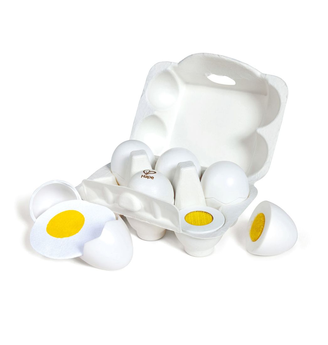 ¡Es hora de desayunar! ¿Cómo quieres tus huevos? Esta huevera de juguete contiene seis huevos: tres huevos cocidos y tres huevos fritos. Las cáscaras se abren para un juego de comidas más realista.