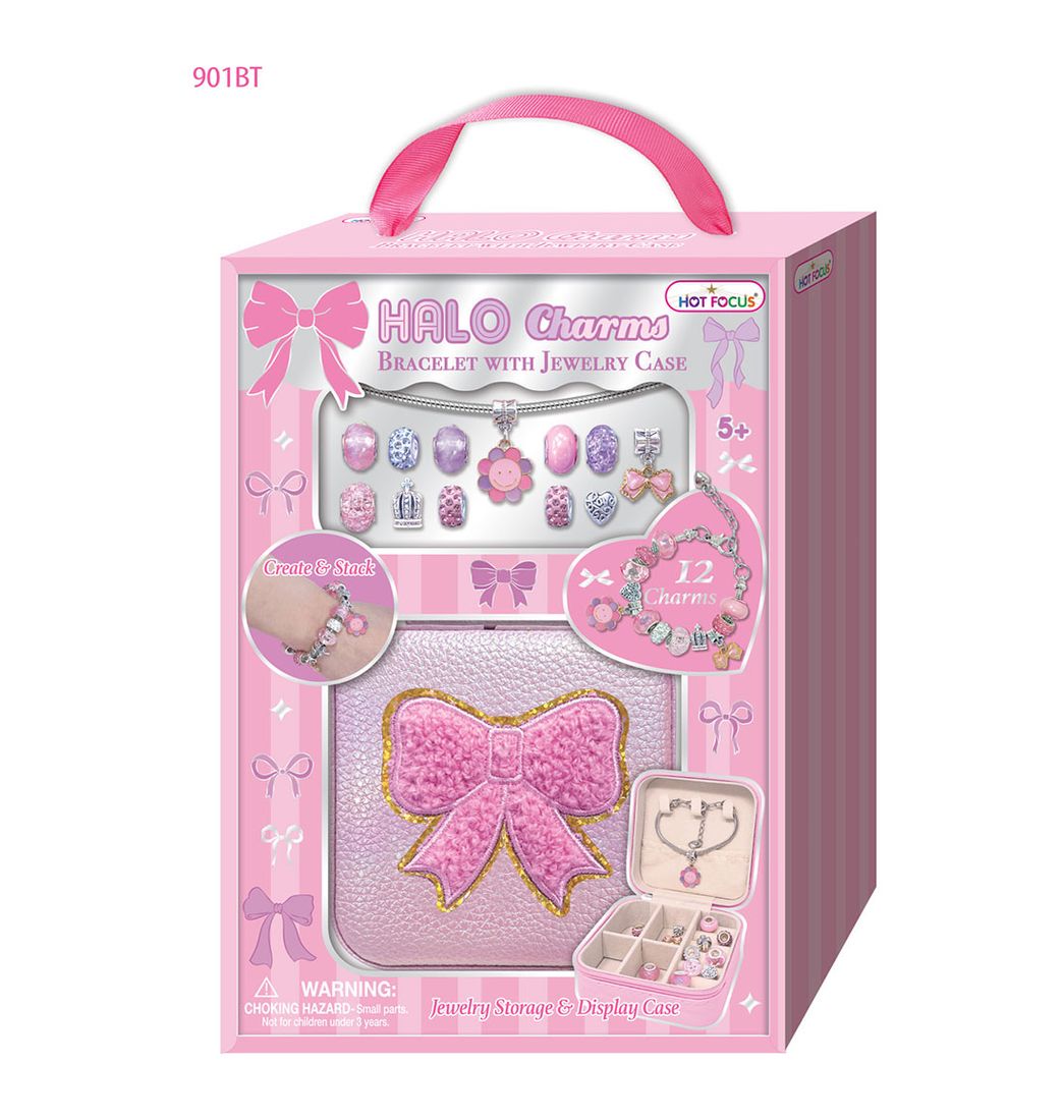 Incluye: 1 juego de pulseras DIY con dijes de halo; 1 joyero con parche.
