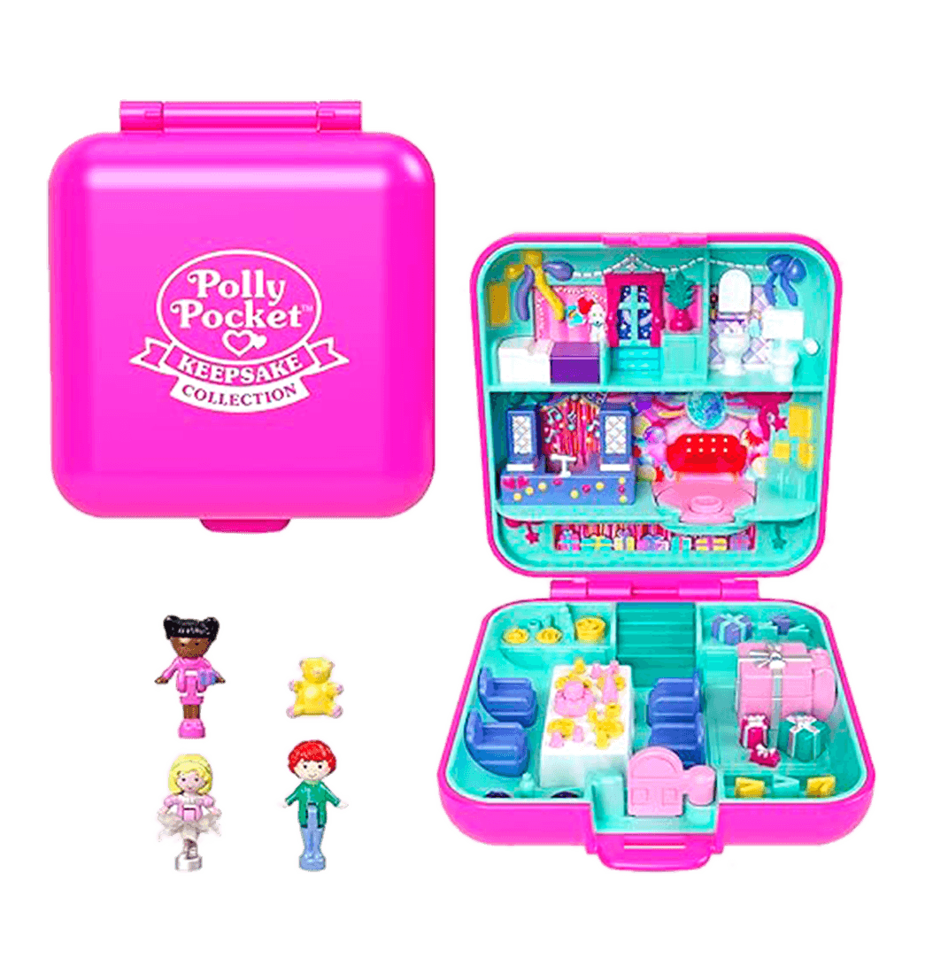 ¡Celebra el 80th aniversario de Mattel con la colección conmemorativa Polly Pocket Keepsake Collection! Este set de juego Heritage Compact se abre para revelar una fiesta en casa con tres micro muñecas (una de ellas con una adorable falda removible) y un tierno osito de peluche como mascota.