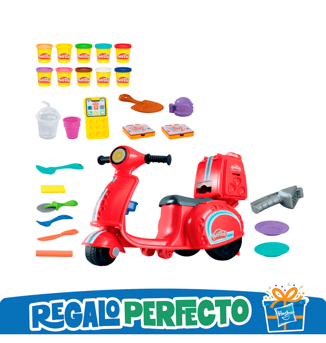 Incluye moto sin armar, 2 cajas de pizza, teléfono celular de juguete, carta de crédito de juguete, paleta de pizza, cortador de pizza, vaso con tapa, molde de helado, cono de helado, herramienta de prensa, espátula, 2 platos, tenedor, cuchillo, rodillo y 10 botes de plastilina Play-Doh (contenido neto: 567 gramos).