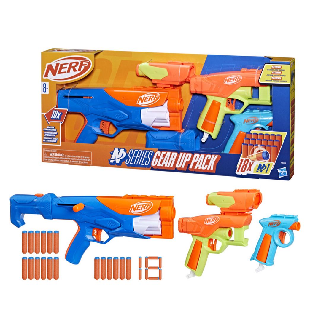 Nerf N Series Gear Up Pack incluye 3 lanzadores distintos y 2 accesorios Nerf con los que podrás crear 10 estilos distintos de lanzador. Arma tu colección de Nerf y prepárate para todo tipo de juegos con este set que incluye 18 dardos de espuma Nerf N1.