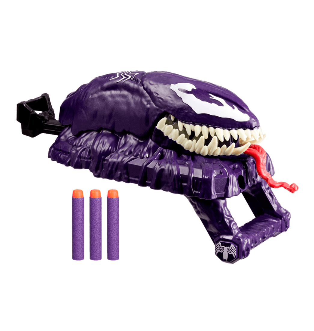 Carga uno de los dardos Nerf incluidos en la boca del lanzador y presiona la cabeza de Venom hacia abajo para cerrarla. ¿Estás listo para lanzarte a la acción? Hala la palanca trasera para abrir la boca de Venom y ver la "saliva" elástica dentro de esta. Después, presiona el botón de la palanca para lanzar los dardos.