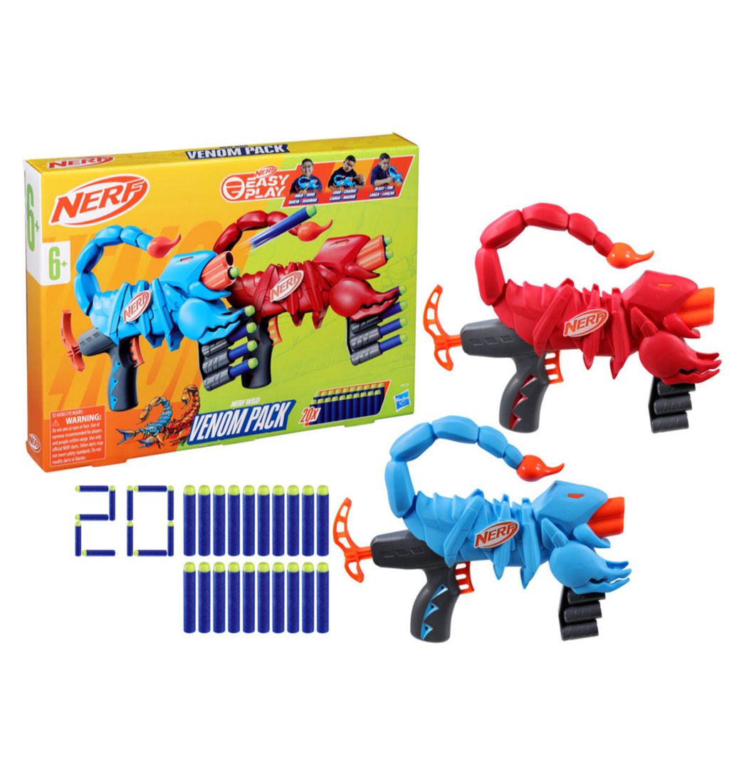¡El pack Nerf Wild Venompack incluye 2 lanzadores Nerf que cuentan con increíbles diseños de escorpión para reproducir la apariencia de los venenosos arácnidos! Cada colorido lanzador con forma de escorpión tiene capacidad para 2 dardos y lanza 1 a la vez. El set incluye 20 dardos flexibles de espuma Nerf Elite.