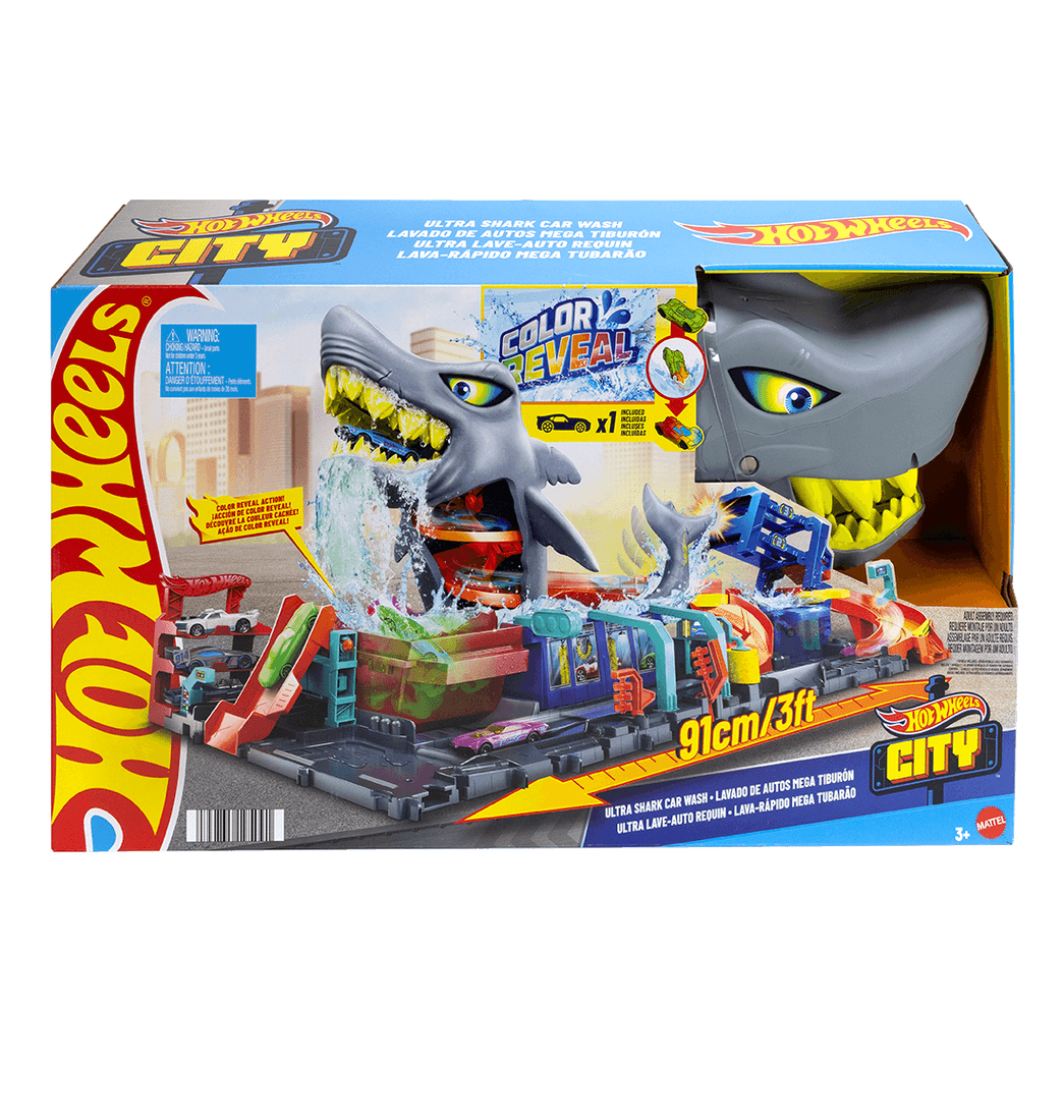 Tal y como aparece en la serie de Netflix, "Let's Race", el centro de lavado de Hot Wheels City ha sido tomado por un enorme tiburón que quiere sumergirse en la acción del cambio de color. Conduce el vehículo Color Reveal sobre la rampa y dentro de la boca del tiburón, luego presiona la cabeza del tiburón para lanzar agua y revelar el color y diseño del coche.