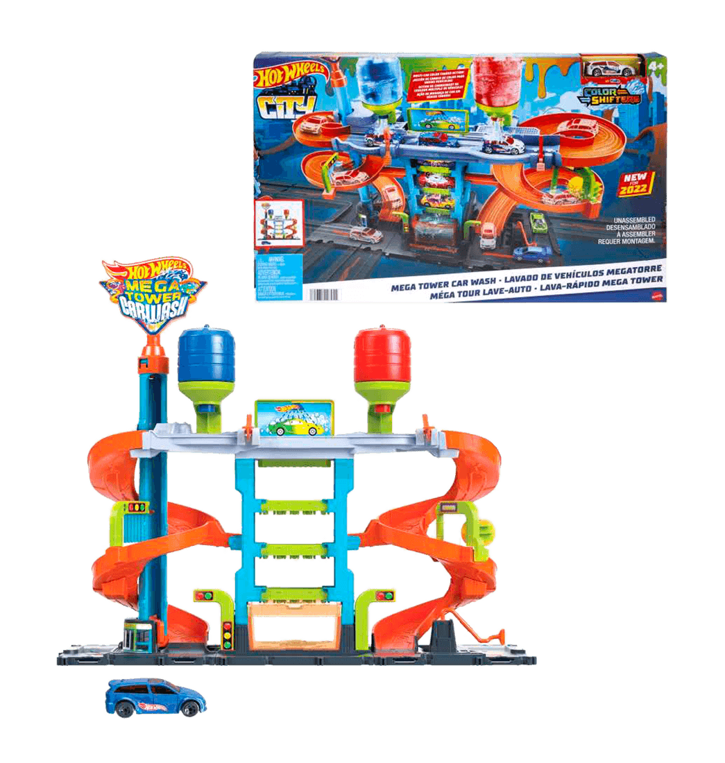 ¡Con el Autolavado Mega de Hot Wheels City disfrutarás de una buena y limpia diversión! Haz una parada en la torre de lavado de autos y gira la manija para mover el auto hacia arriba en la espiral giratoria. En la parte superior, hay dos tanques de agua que rocían agua caliente y fría sobre el vehículo Color Shifters incluido para cambiar mágicamente su color. Se venden por separado. Los colores y las decoraciones pueden variar. ¡Sorpréndelo ahora con este magnífico juguete para niños y anímate a llevarlo!.