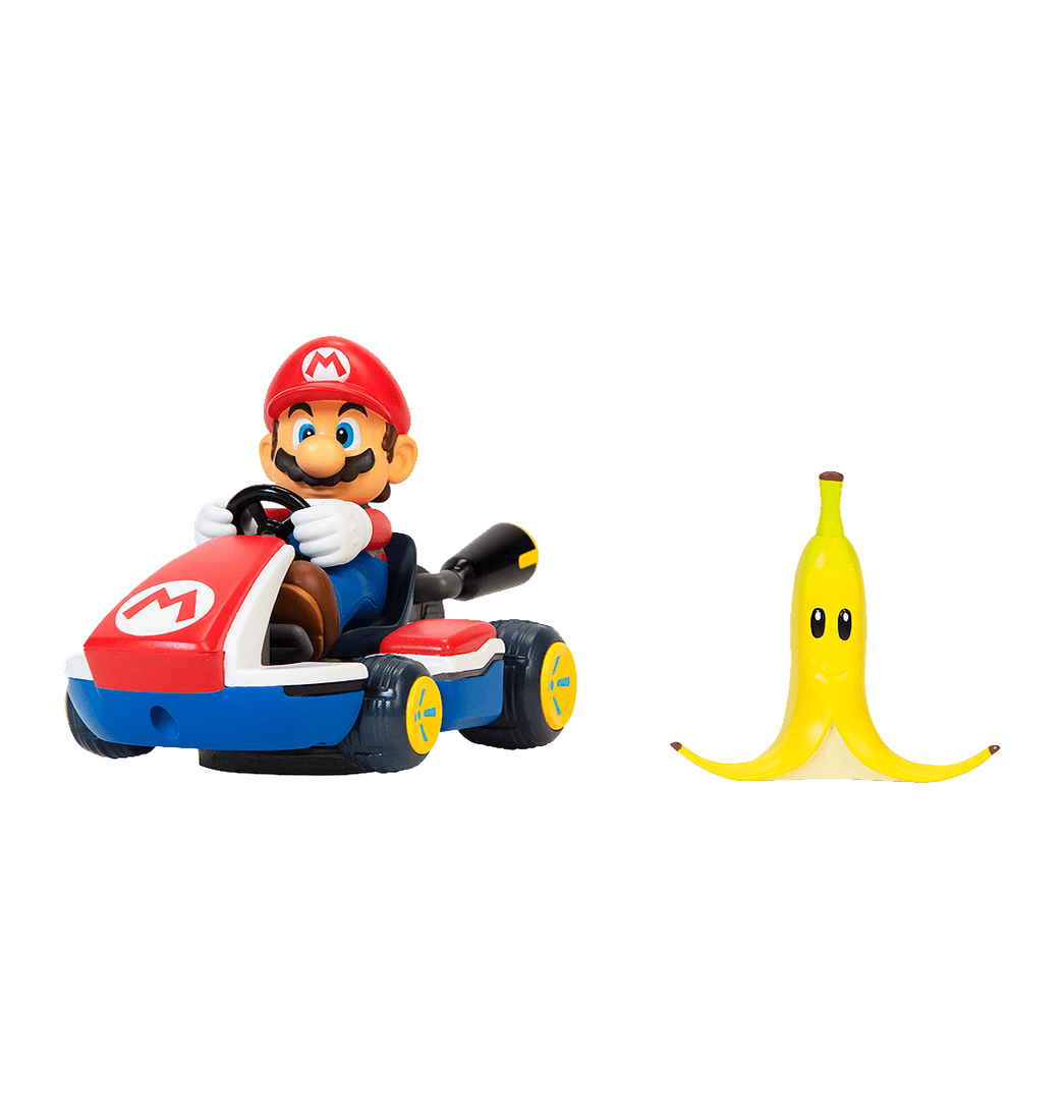 Lleva la acción de Mario Kart a la vida real con este fabuloso Carro Megagiros 360°. Este set incluye una figura en su kart y el accesorio Banana, perfecto para recrear escenas del videojuego, armar carreras en casa o para colección.