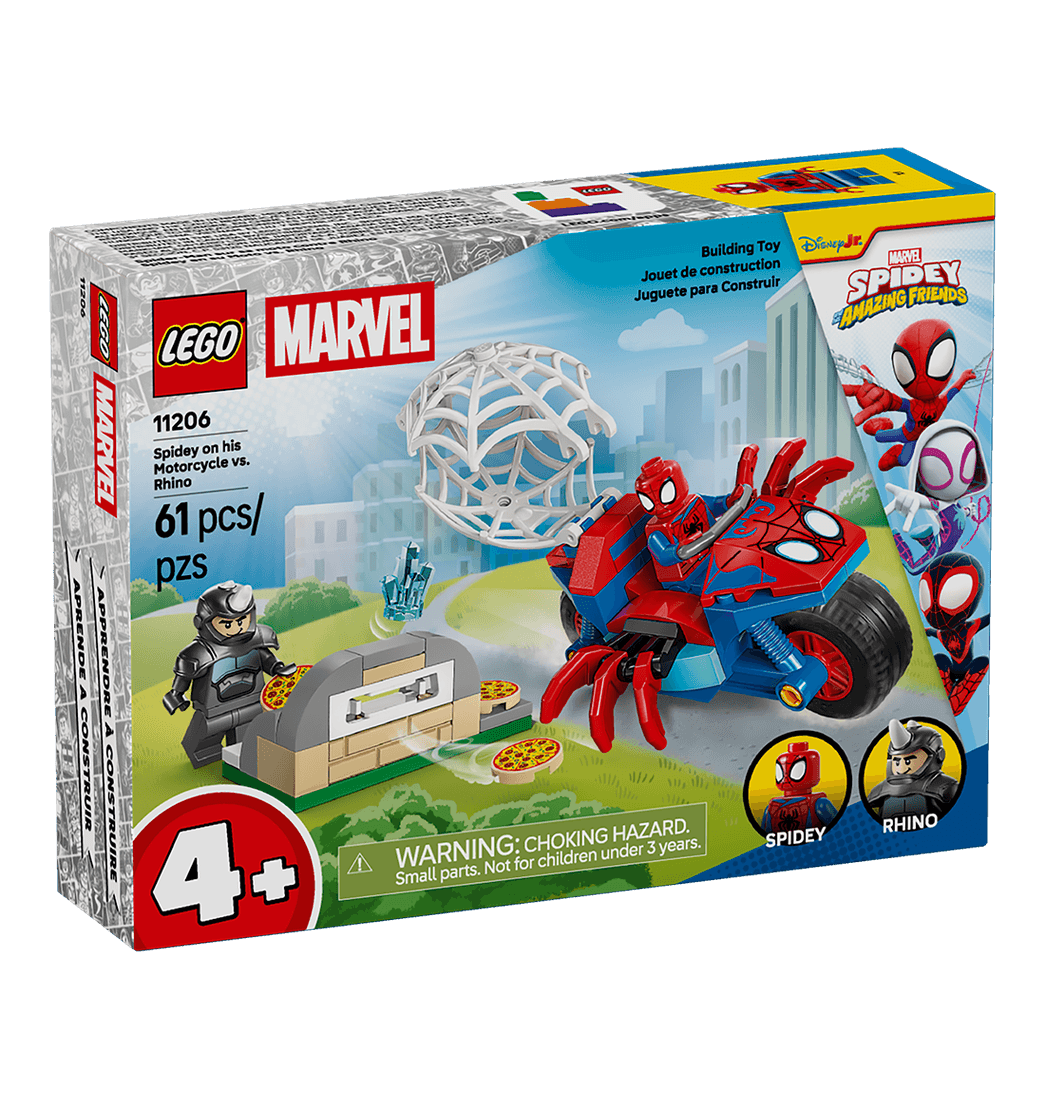 ¡Pon la acción del mundo de los superhéroes en las manos de tu peque con el juguete Spidey en su Moto vs. Rino (11206) para niños y niñas! Este set de construcción, que incluye una moto con forma de araña y minifiguras de Spidey y Rino, es perfecto para ayudar a los más jóvenes a desarrollar su creatividad.