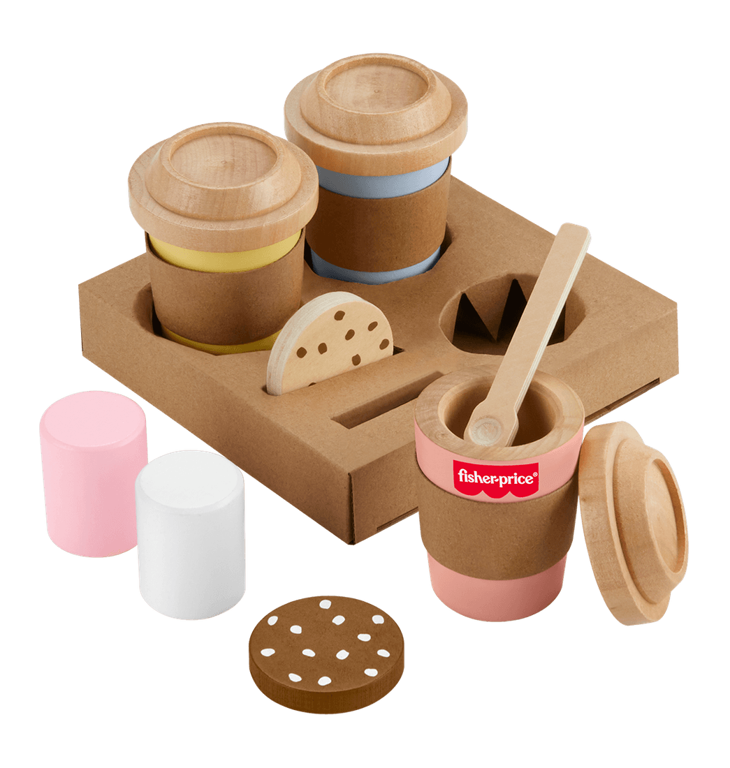Los niños en edad preescolar pueden disfrutar de horas de juego de simulación con el Set Mi Primer Capuchino de Madera de Fisher-Price. Este set de 15 piezas incluye 3 tazas de café para llevar con tapas y fundas, una cuchara para remover, 2 galletas y 2 malvaviscos que sirven como "entremés", y un portavasos para llevarlo todo.
