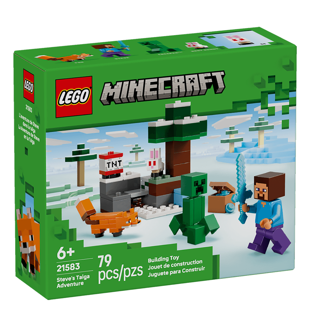 Lleva a tu jugador de Minecraft a otro nivel con La Aventura de Steve en la Taiga, un set de construcción coleccionable para niños y niñas. Este pequeño set LEGO lleno de diversión explosiva invita a los niños a explorar su acción de combate y búsqueda de tesoros con una minifigura de Steve y figuras LEGO de un Creeper, un zorro y un conejo bebé..