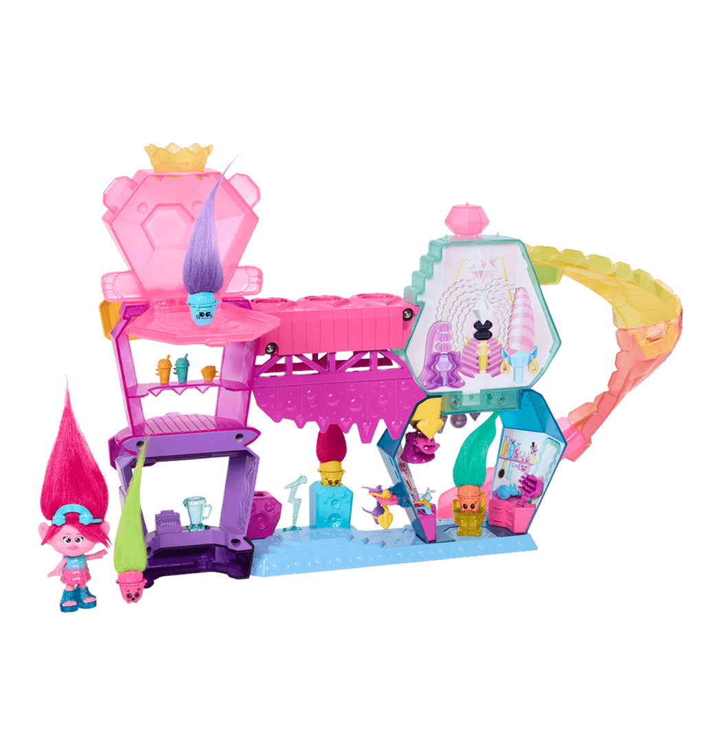 Inspirado en la icónica ubicación de Trolls Band Together de DreamWorks, el set ofrece dos historias con un tobogán extraíble y otras múltiples áreas de juego, como una barra de comiditas, un vestidor y un escenario. Un lanzador de Hair Pops agrega más diversión a la hora de jugar.