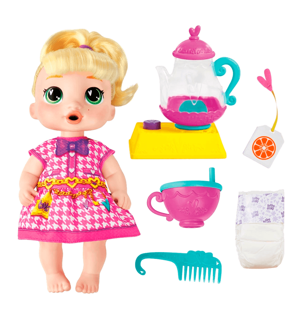 Incluye muñeca, tetera, cocina de juguete, taza de té, bolsa de té, peine y pañal.