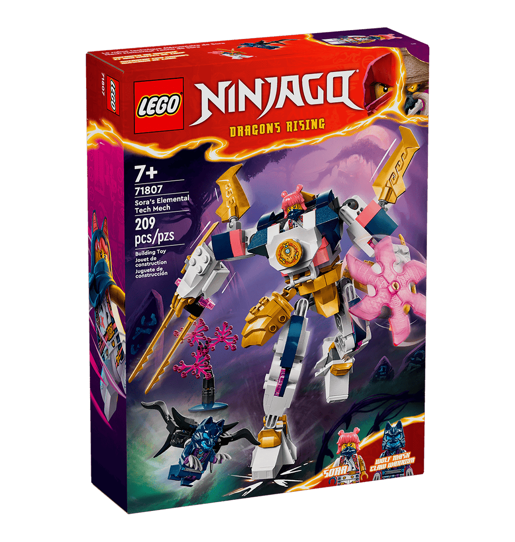 Armado con una gran espada y una cuchilla giratoria, ¡el Meca Elemental Tecno de Sora está listo para enfrentarse a un malvado guerrero con garras Máscara de Lobo en el Bosque de las Sombras! Y no solo eso: ahora, por primera vez, podrás combinar las partes de los 3 alucinantes mecas ninja pilotados por Cole, Sora y Kai para crear tu propio meca.