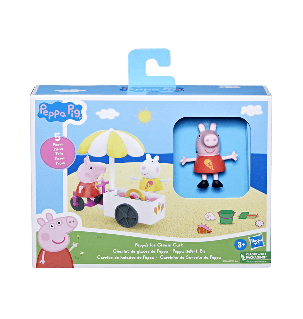 ¡Imagina días de verano con el set de juego el Carrito de helados de Peppa! ¡Este set de Peppa Pig viene con 5 piezas y 2 figuras de personajes favoritos de la serie Peppa Pig, Suzy Oveja y Peppa, las cuales llevan ropas con temática de helados!