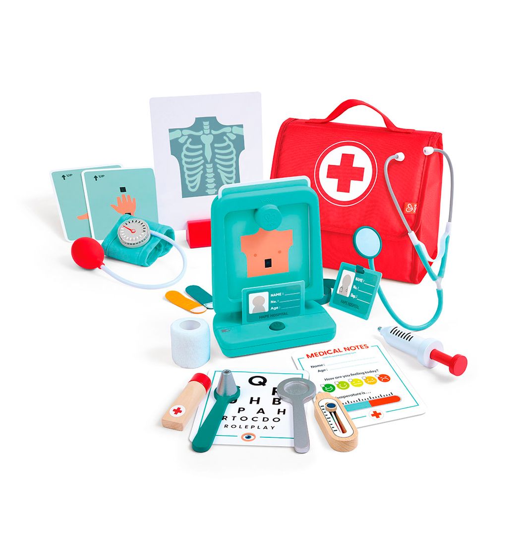 Con los juguetes de Hape, los más pequeños de casa pueden explorar, imaginar y desarrollar habilidades mientras se divierten en grande. Este juego de Doctor incluye una gama completa de accesorios que imitan instrumentos médicos reales, incluyendo una máquina de rayos X de juguete con capacidades de proyección, un monitor de presión arterial, un estetoscopio, un termómetro, un otoscopio y muchos más.