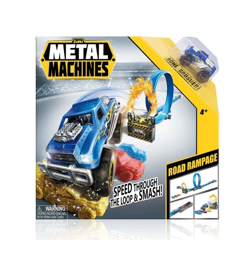 Diviértete en grande con la fabulosa Pista Road Rampage de Metal Machines. Lanza el carro incluido con el poderoso lanzador de Metal Machines y muévete a máxima velocidad por el loop de 360°, salta sobre los autos y destrózalos por completo.