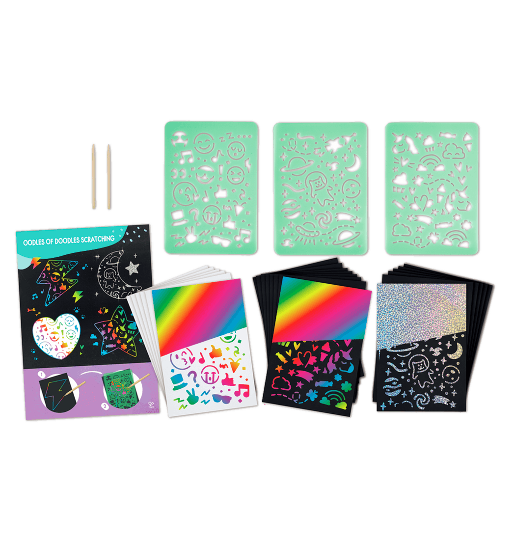 ¡¡Lleva los garabatos a un nivel completamente nuevo con este increíble juego para rascar! Coloque las plantillas sobre las hojas incluidas y raspe con un lápiz de madera para revelar diferentes capas de colores debajo. Incluye un cartel con consejos y sugerencias. ¡Perfecto para usar en el caballete de mesa Hape!