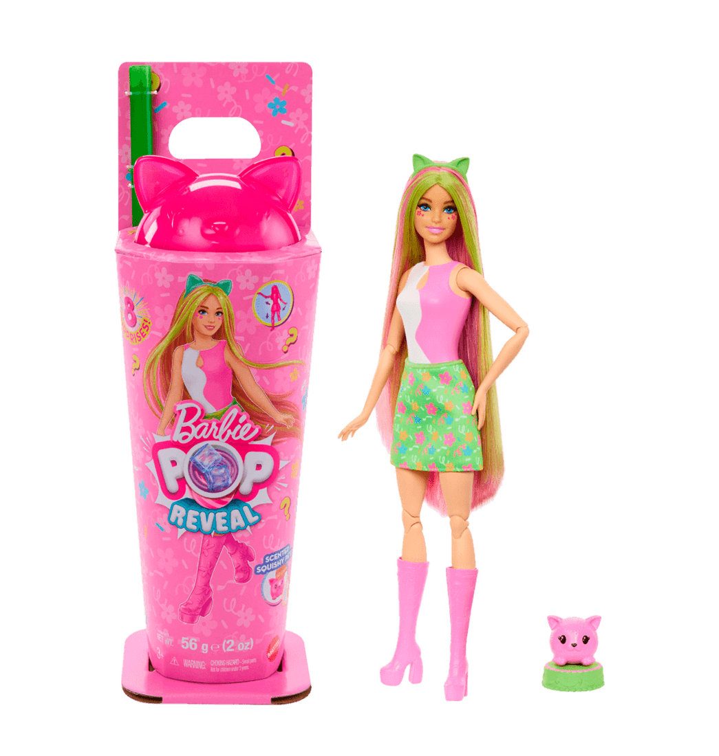 Barbie Pop Reveal Serie de Animalitos Sorpresa ofrece una divertida aventura sensorial con ocho increíbles sorpresas dentro de un vaso inspirado en malteadas. Desenrosca la tapa en forma de orejita de animalito y atraviesa con el popote la película y revela un slime brillante y una blandita sorpresa.