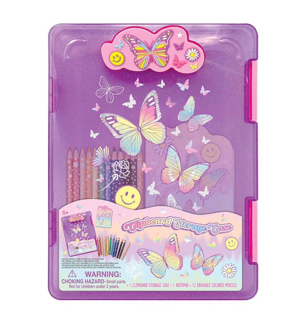 Incluye: 1 bloc de notas; 1 portapapeles; 12 lápices de colores borrables.