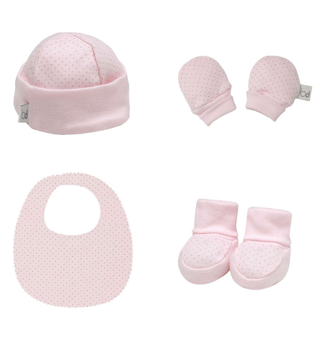 El set 4 piezas bebé Dots de Monbaby es un básico imprescindible para los primeros días de tu bebé. Esta confeccionado en 100% algodón, incluye gorro, babero, guantes y patucos, todo con un delicado estampado de lunares que aporta un toque clásico y encantador.