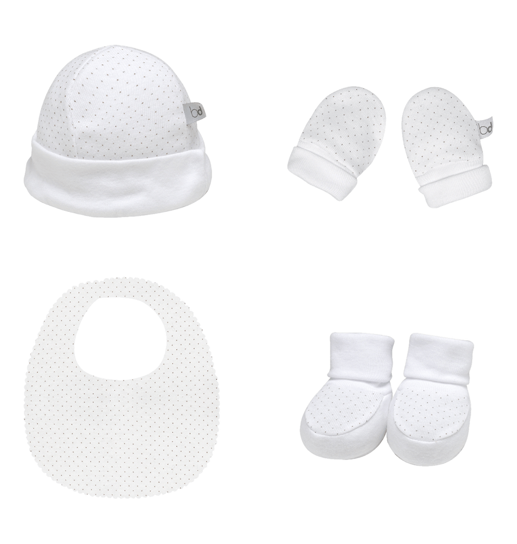 Set Primer Día 4 Piezas Gorro, Babero, Guantes y Patucos Unisex - Monbaby 0-1M