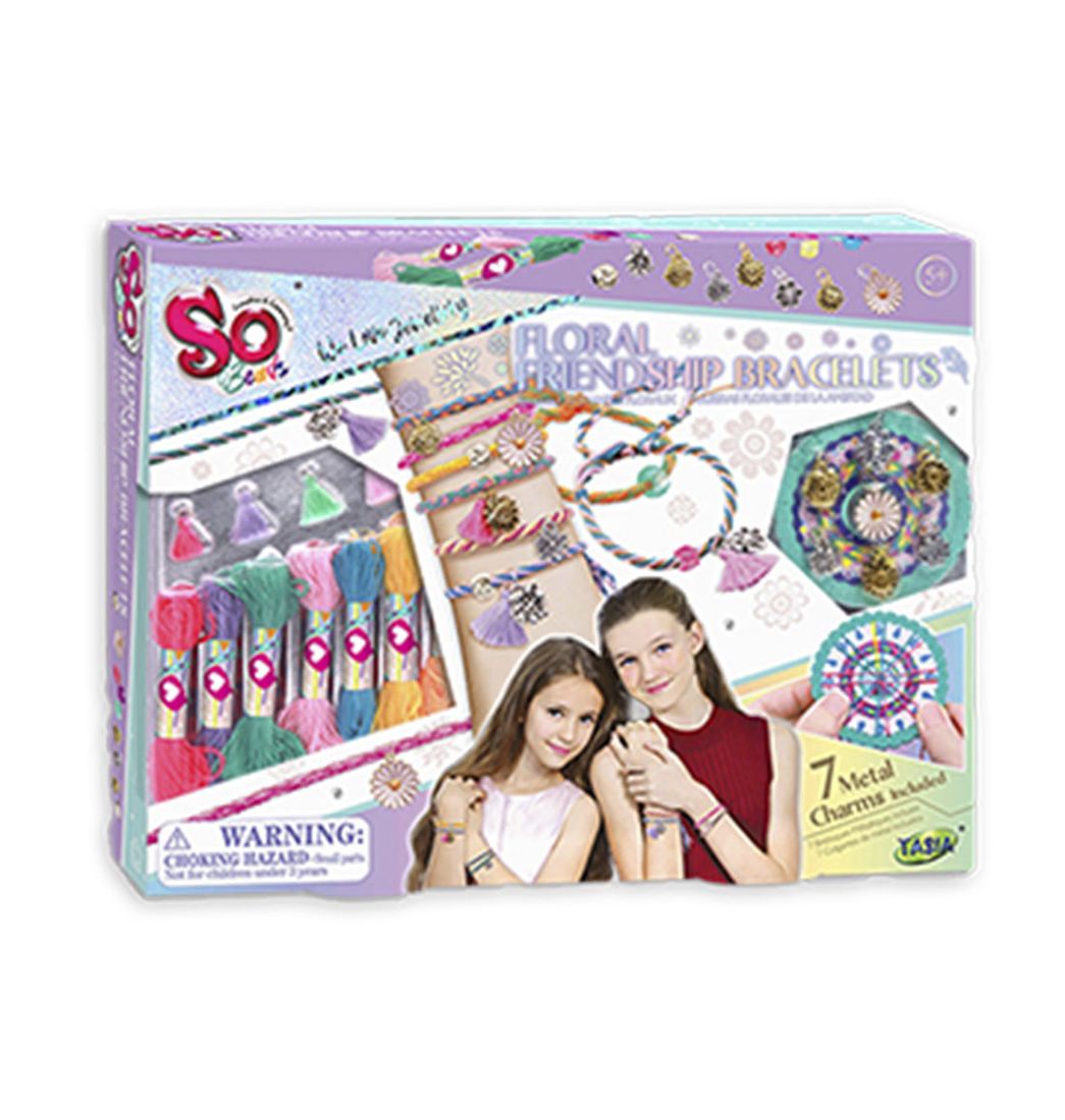 Incluye dijes metálicos, cuentas, rueda para pulseras, tarjetas de patrones, hilos de algodón, borlas, manual.
