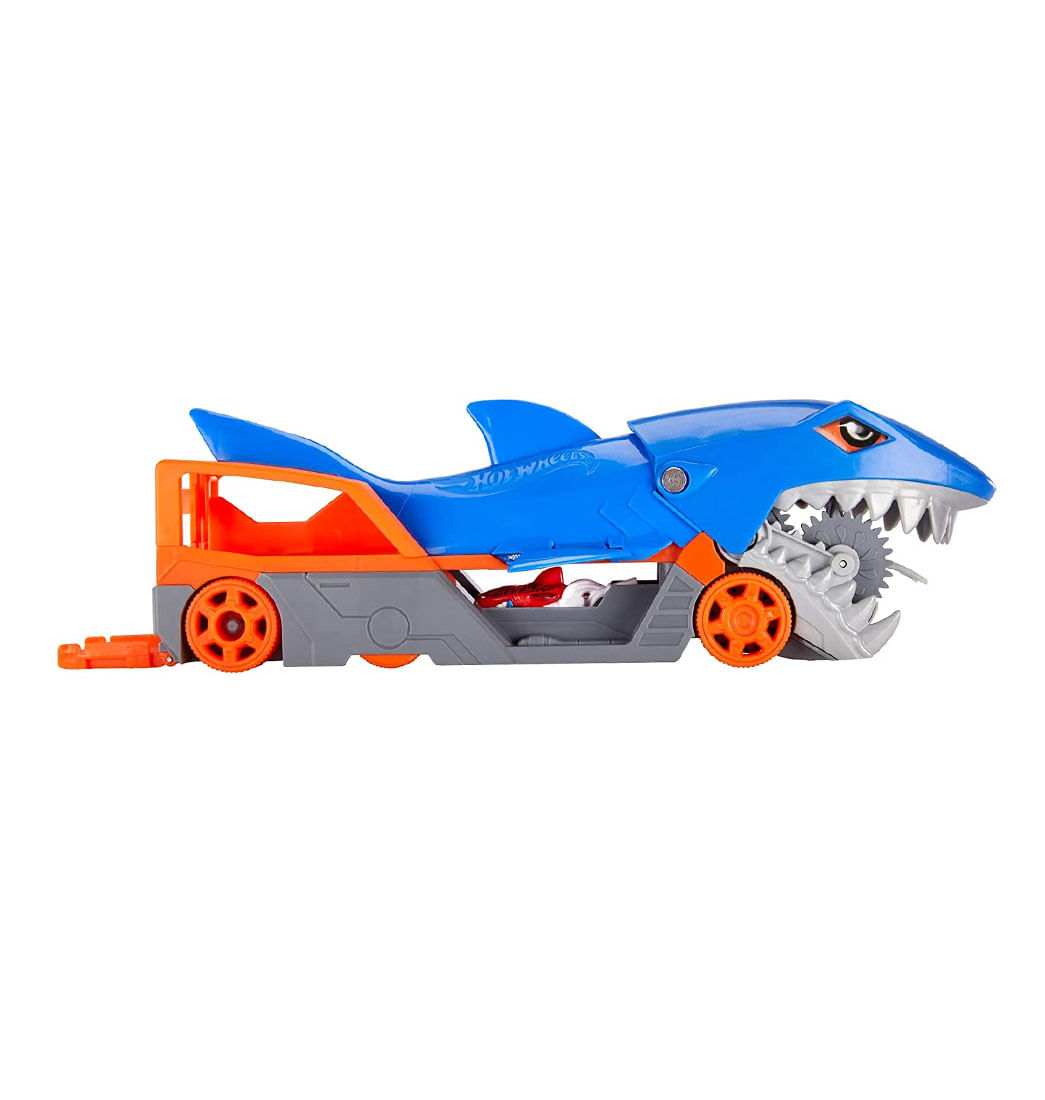 El Set de juego Remolque Tiburón de Hot Wheels® re-imagina el icónico vehículo de mandíbula de tiburón de Hot Wheels® como un genial nuevo transportador. Gracias al mecanismo especial de mordida que se activa cuando los niños lo presionan, el tiburón agarra un vehículo directamente con su mandíbula y lo almacena en su estómago. ¿Necesitas descargar? Tiene una rampa de salida en la parte trasera para un sencillo tránsito. El vehículo Remolque Tiburón de Hot Wheels® viene con un vehículo Hot Wheels® a escala 1:64 y puede almacenar hasta cuatro carros más (Se venden por separado). A tu pequeño seguro le encantará este fabuloso juego lleno de diversión. Los colores y las decoraciones pueden variar. Recomendado para niños mayores de 4 años.