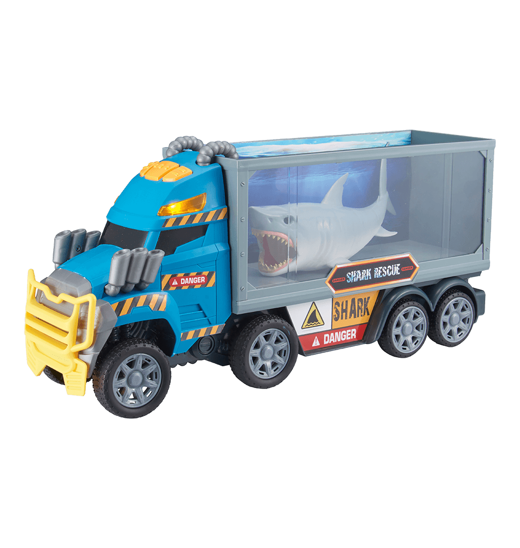 ¡Transporta al Tiburón de regreso al agua con Teamsterz Shark Rescue! Este juego viene con un Tiburón extraíble y un camión de rescate con luces y sonidos. Presiona los botones para escuchar música; alarmas y sonidos de salpicaduras de agua; así como luces intermitentes. ¡Este camión de rescate avanza con solo presionar un botón mientras el Tiburón se sacude e intenta escapar del tanque!