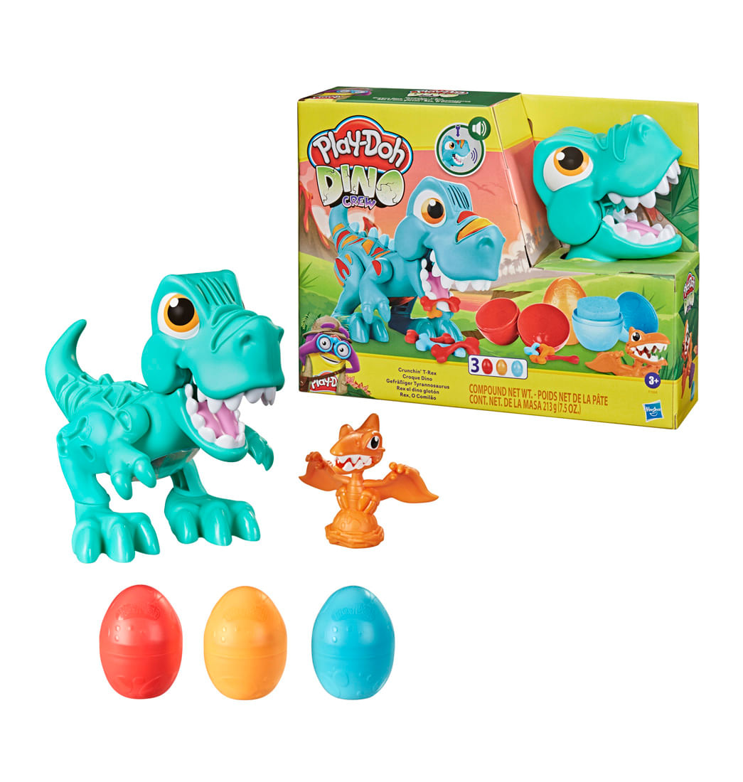 ¡Hay tantas formas de explorar la creatividad con este juguete de tiranosaurio Play-Doh! Imagina aventuras prehistóricas una y otra vez con la figura de dinosaurio verde, su amigo pterodáctilo y 3 huevos Play-Doh llenos de masa para moldear no tóxica. Escucha al dinosaurio masticar, tragar y eructar cuando los niños accionan la mandíbula y mira cómo los pequeños trozos de masa para moldear pasan por la pancita y salen por la parte posterior. La figura de amigo pterodáctilo moldea huevos para el nido. ¡Es un fantástico regalo para los pequeños fans de dinosaurios!