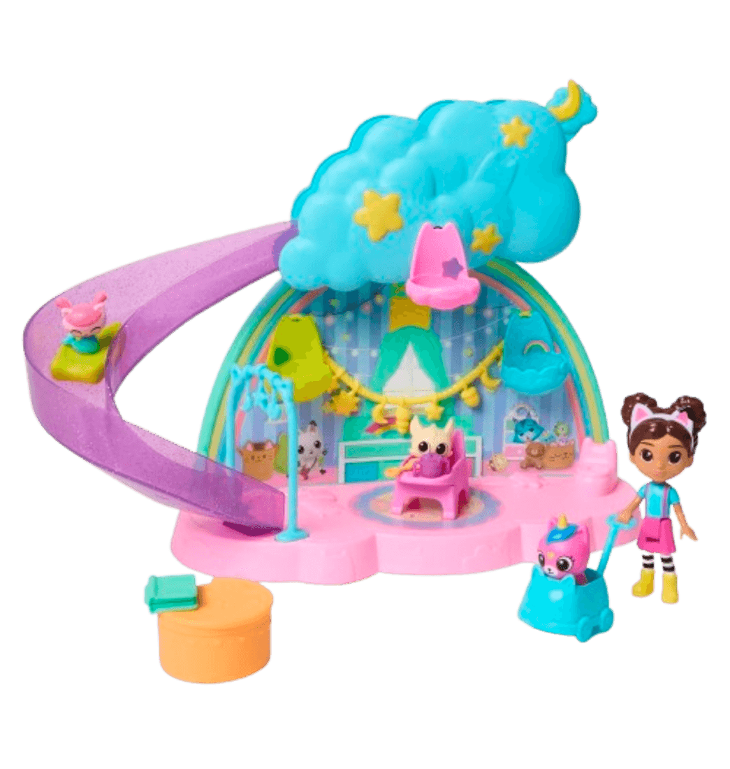 Incluye figura de Gabby , 3 figuras de gatitos bebés: Kittycorn, MerCat y Meowl, 1 tobogán brillante, 3 cunas, 1 arco decorativo, 1 silla alta, 1 cadena de luces, 1 vaso con tapa, 1 carrito de paseo, 1 sonajero, 1 libro de cuentos, 1 caja de "Dollhouse Delivery" con accesorio sorpresa.