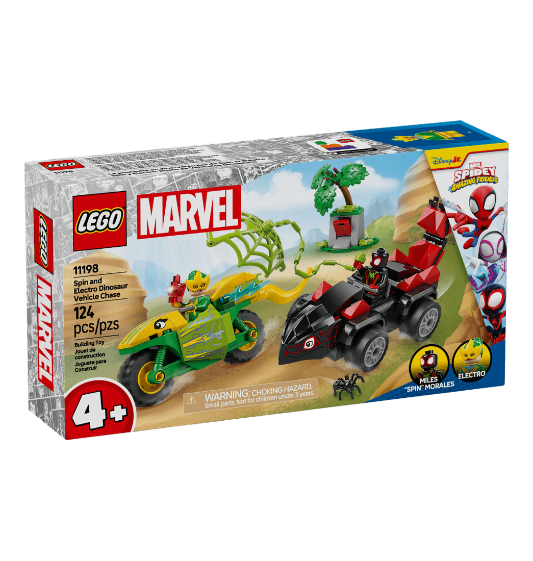 El set LEGO recrea la acción de la temporada “Dinotelarañas” de la serie para televisión Spidey y su superequipo. Viene con 2 minifiguras y 2 dinovehículos: Miles “Spin” Morales en el Coche Estegosaurio y Electro en la Moto Dilofosaurio. Una gran telaraña, un cristal oculto en una roca y accesorios que representan el paisaje pondrán en marcha el juego de interpretación creativo.
