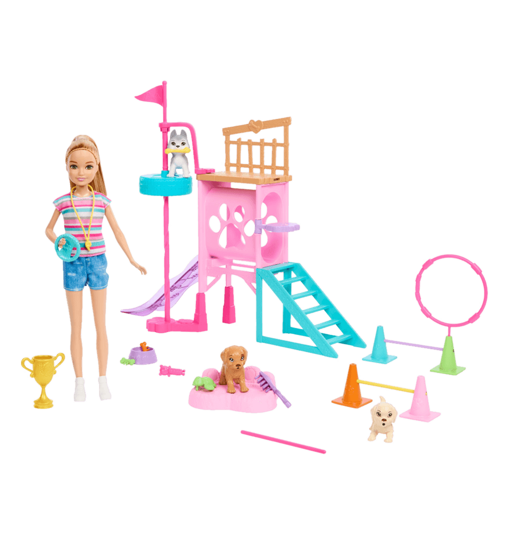 ¡Es momento de entrenar a las mascotas más adorables! Los niños y las niñas podrán mostrar su amor por las mascotas con la muñeca Stacie y el set de juego de Entrenadora de Cachorritos.