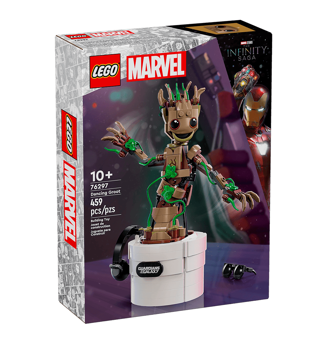 Este LEGO de Groot cuenta con cabeza móvil y brazos articulados. Cuando los peques giran la manivela en la parte posterior de la maceta, Groot empieza a bailar. La figura puede adaptarse con hojas adicionales, auriculares construibles y gafas de sol.