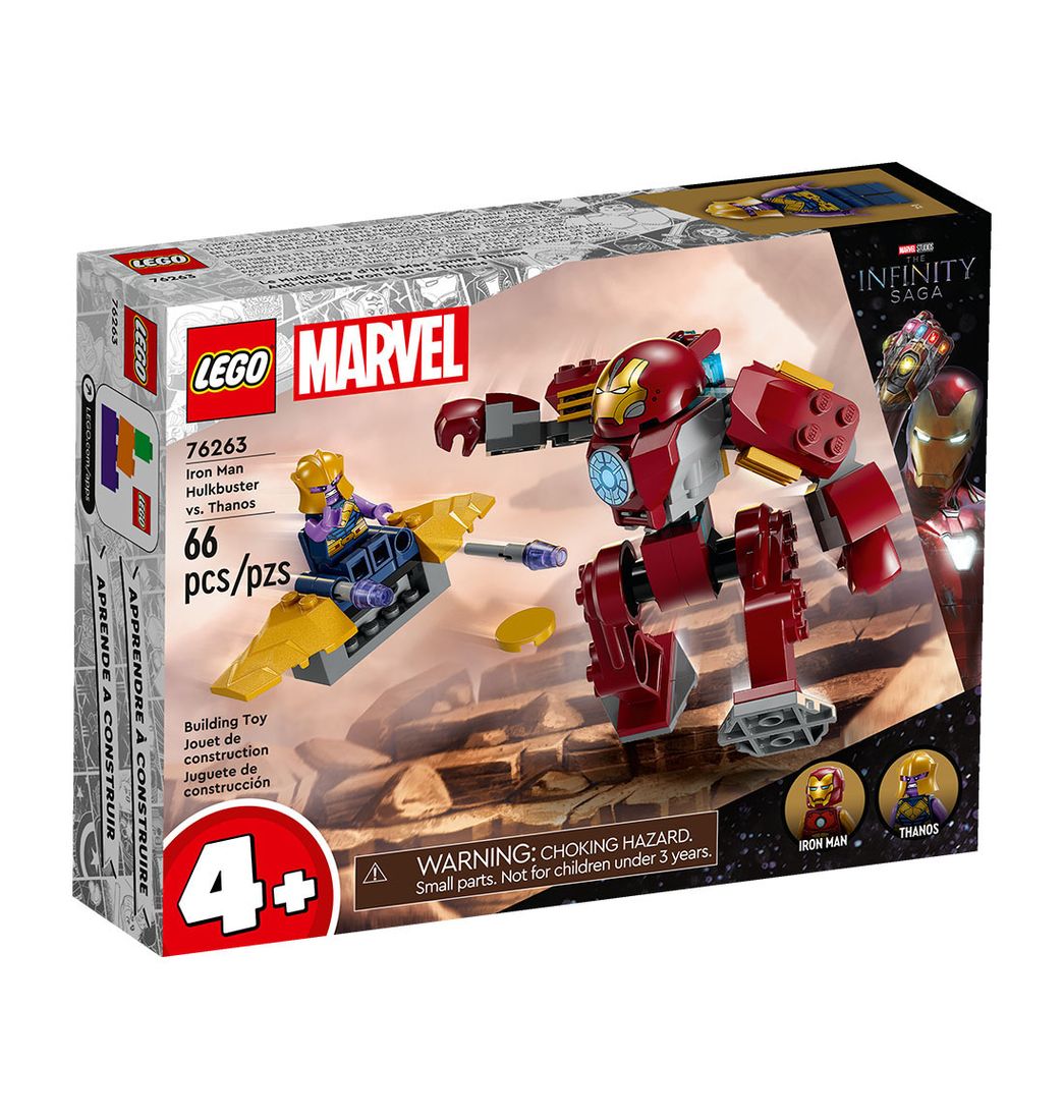 Basado en Vengadores: Infinity War, la película de Marvel Studios, el set incluye al superhéroe Iron Man con su meca y al supervillano Thanos con su nave. El Hulkbuster articulado cuenta con asiento para la minifigura de Iron Man y la nave está equipada con lanzador de discos y asiento para la minifigura de Thanos.