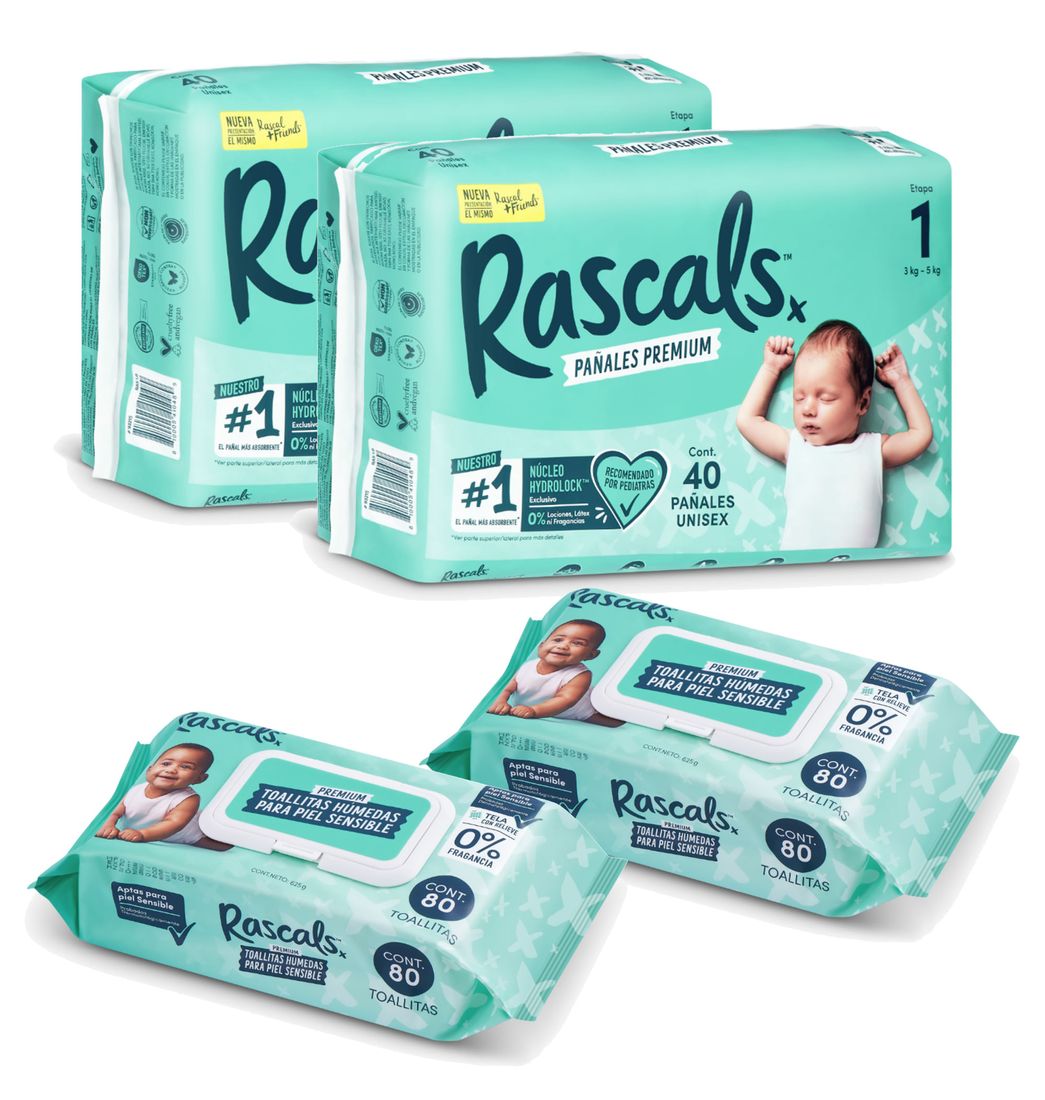 Este set de Rascals, que incluye 80 pañales premium de la Etapa 1 para bebés de 3 a 5 kilogramos y 160 toallitas húmedas especialmente diseñadas para piel sensible, es la combinación perfecta para mantener a tu bebé siempre protegido.