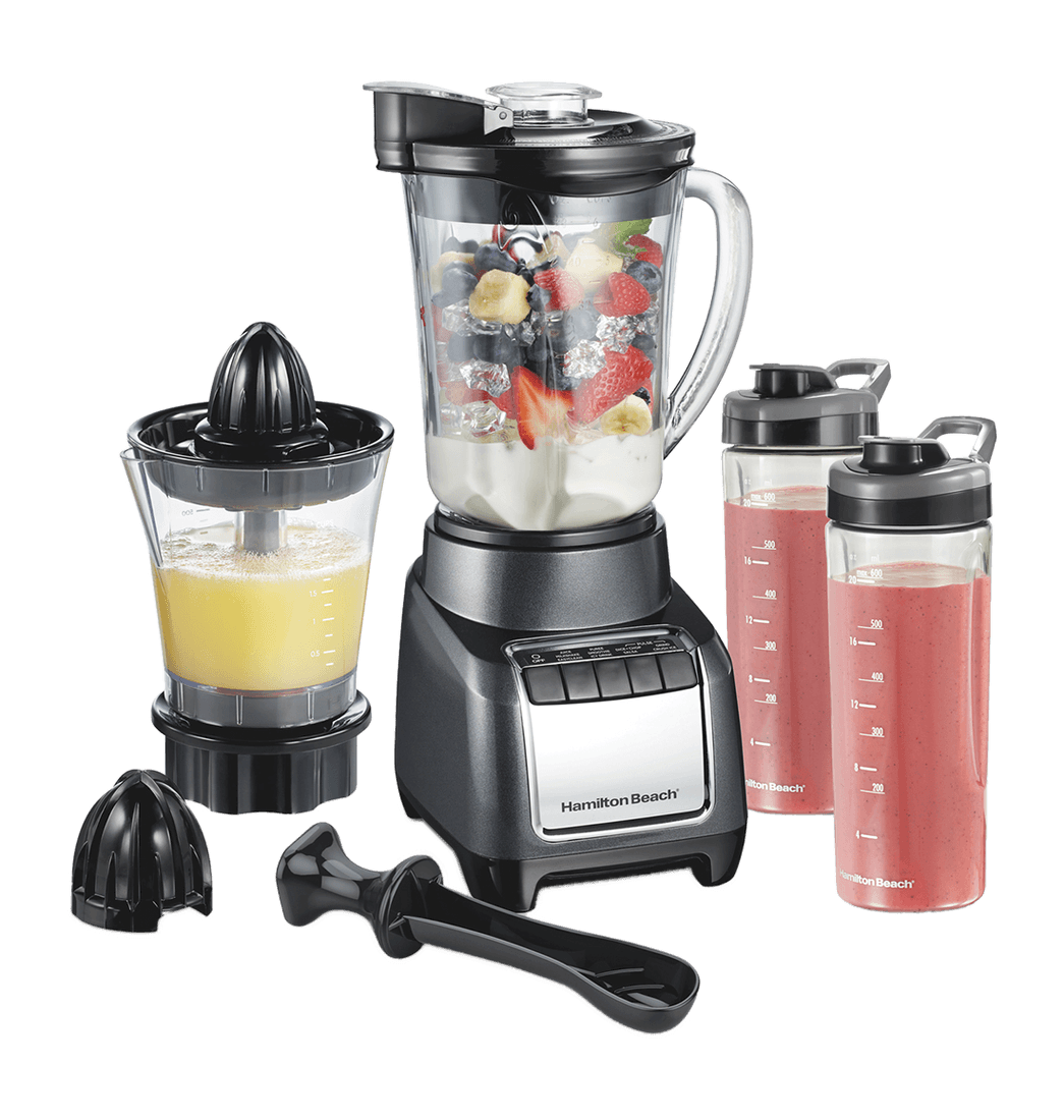 Lleva tus bebidas y recetas al siguiente nivel con el sistema 3 en 1 para mezclar y exprimir Hamilton Beach. Es como tener 3 electrodomésticos en uno multiusos. Tenlo en tu cocina para añadir jugo fresco a batidos, bebidas heladas o cócteles, preparar jugo de naranja o limonada caseros con el exprimidor o mezclar y listo con los dos frascos personales con tapas de viaje.