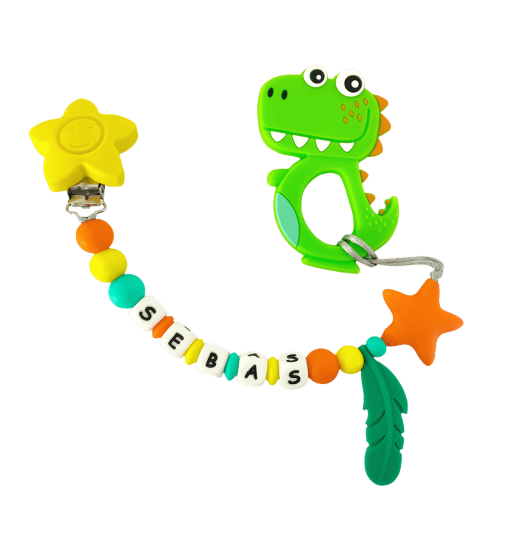 Con una encantadora figura mordedora y el nombre de tu pequeño/a (hasta 10 letras), este sujetador no solo calma sus encías, sino que estimula su curiosidad y sentidos. Además, su clip resistente permite sujetarlo fácilmente a la ropa, la cobija o el coche, evitando caídas y manteniendo todo siempre a la vista. También puedes usarlo como portachupo.