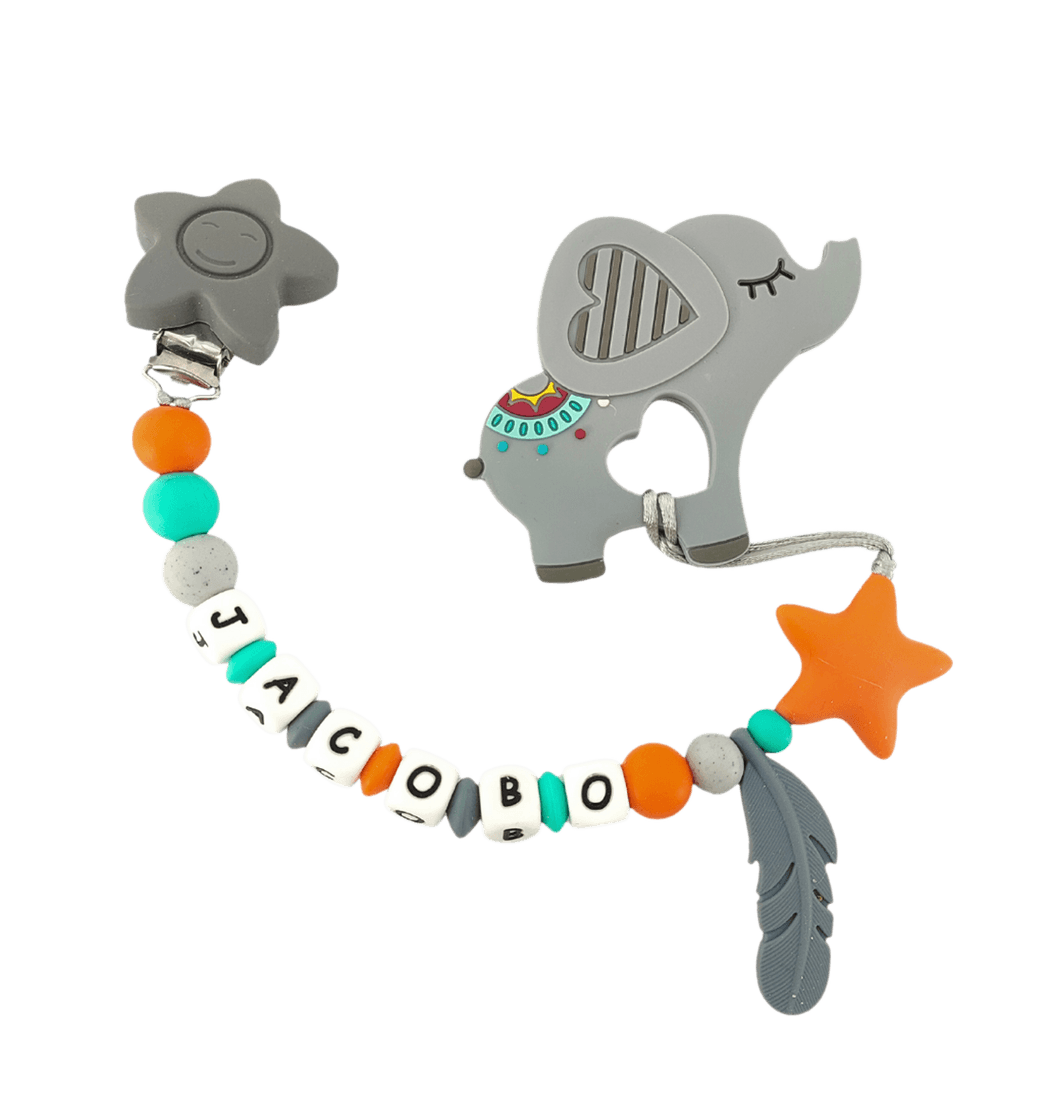 Con una encantadora figura mordedora y el nombre de tu pequeño/a (hasta 10 letras), este sujetador no solo calma sus encías, sino que estimula su curiosidad y sentidos. Además, su clip resistente permite sujetarlo fácilmente a la ropa, la cobija o el coche, evitando caídas y manteniendo todo siempre a la vista. También puedes usarlo como portachupo.