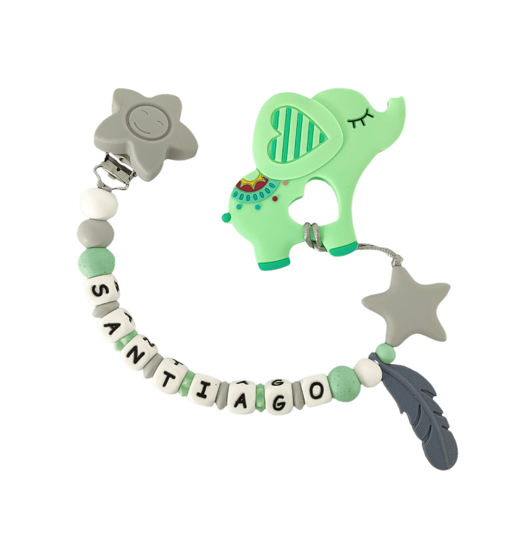 Con una encantadora figura mordedora y el nombre de tu pequeño/a (hasta 10 letras), este sujetador no solo calma sus encías, sino que estimula su curiosidad y sentidos. Además, su clip resistente permite sujetarlo fácilmente a la ropa, la cobija o el coche, evitando caídas y manteniendo todo siempre a la vista. También puedes usarlo como portachupo.