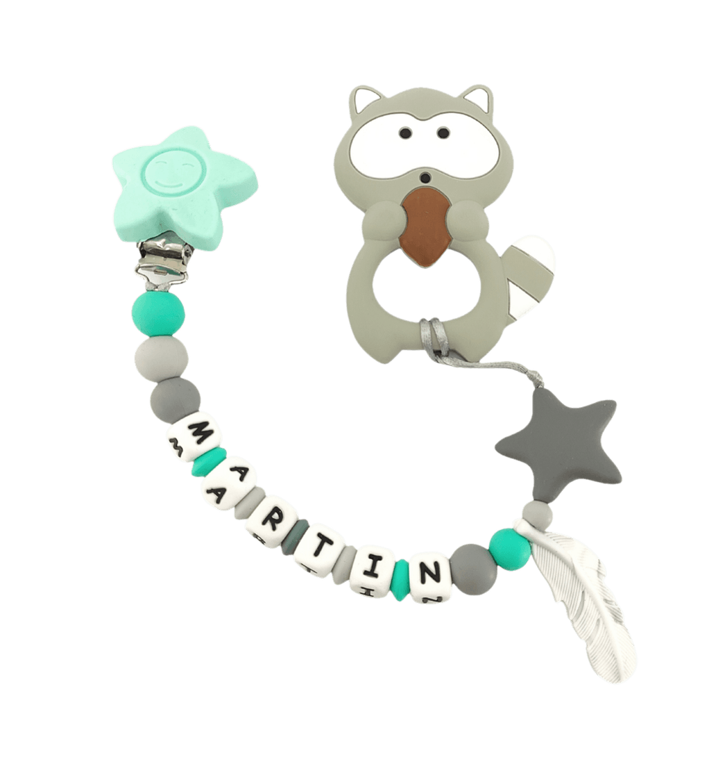 Sujetador Mordedor con Nombre Mapache Kiwi - Mami Mauss
