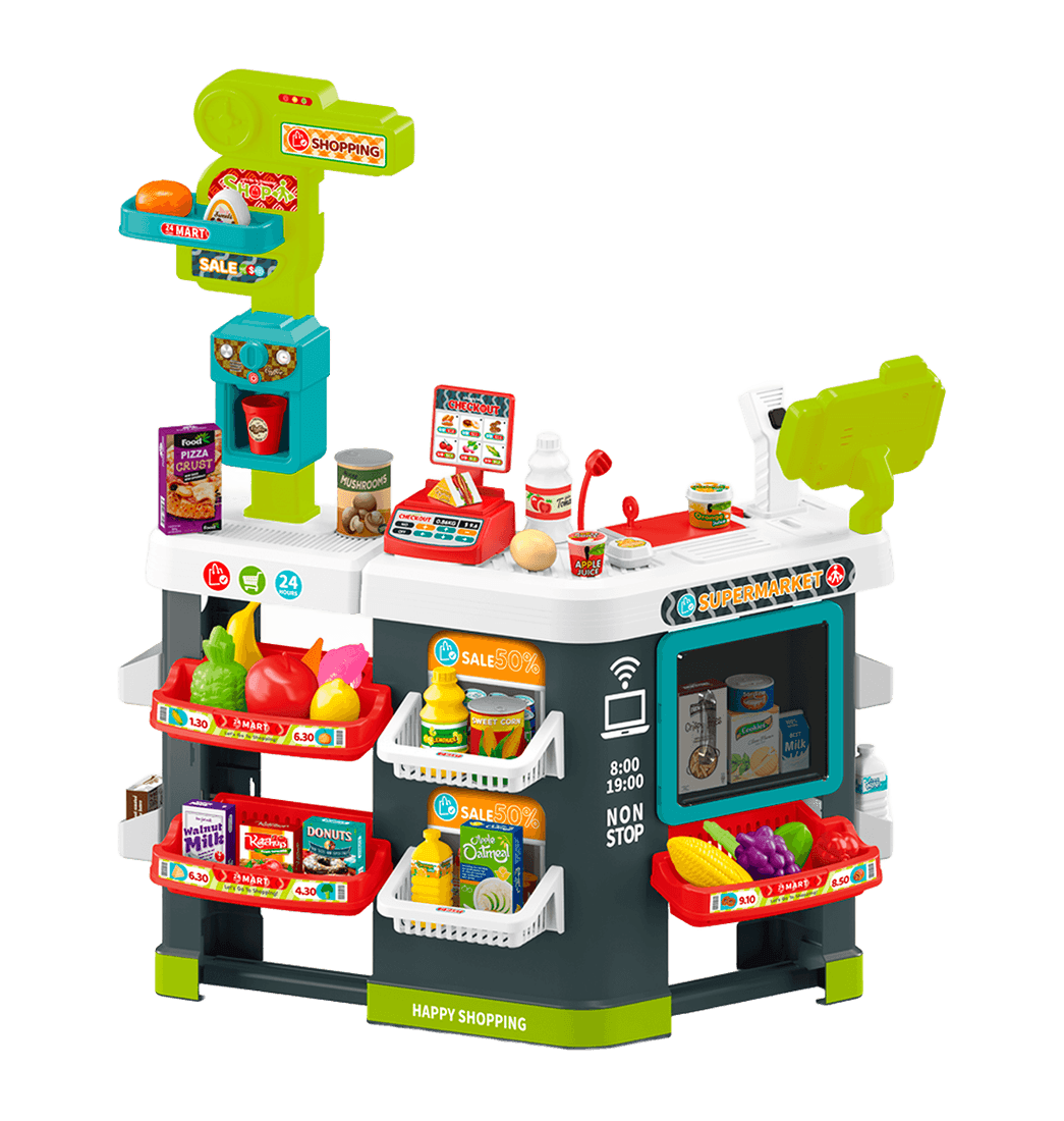 Fabuloso y divertido supermercado de jugueteperfecto para recrear un juego entremetido y lleno de imaginación. Este increíble supermercado cuenta con 81 piezas, luces y sonidos reales. Este set permite a los niños crear su propio minimercado en casa.