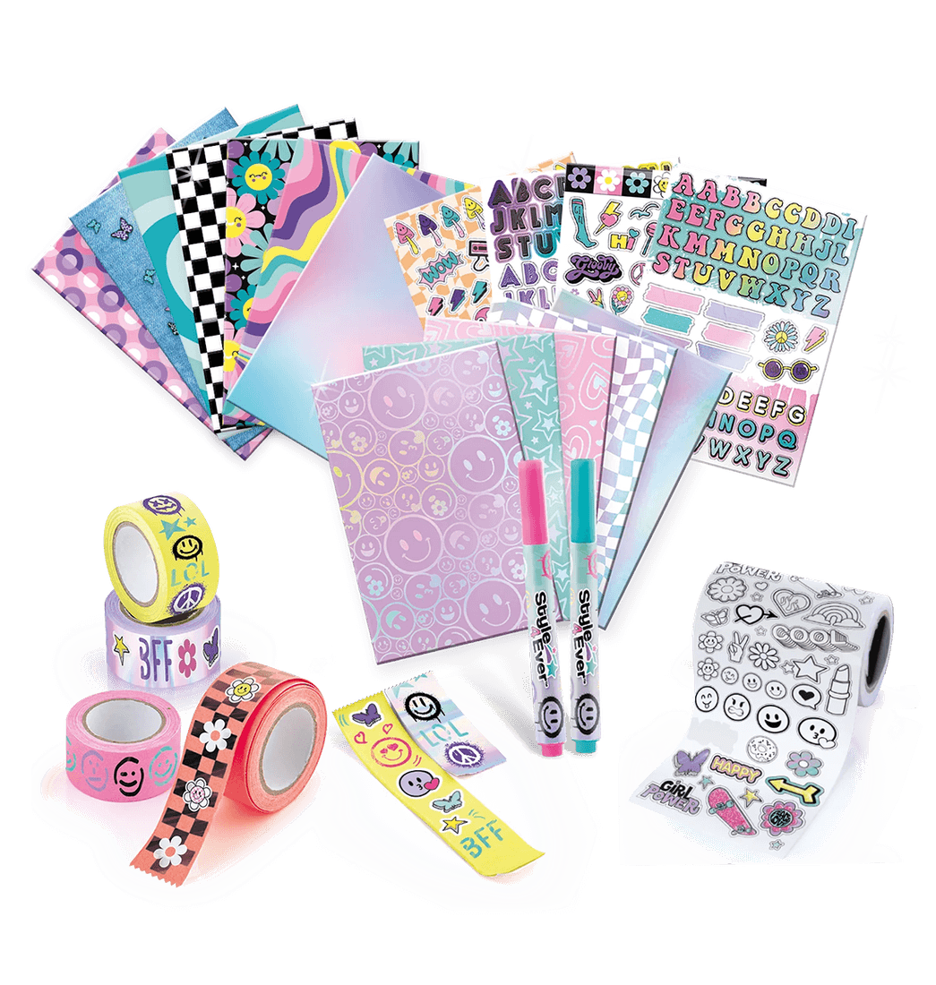 Incluye 4 hojas de pegatinas, 2 rollos de pegatinas, 4 rollos de cinta adhesiva, 1 bolsa de gemas, 3 plantillas, 25 hojas de papel impresas, 2 rotuladores, 2 hojas de papel precortadas y 1 barra de pegamento.