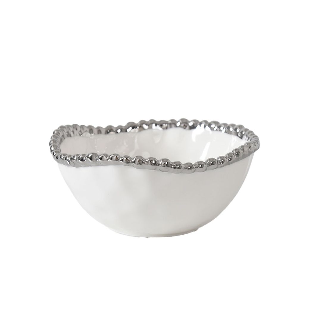 Este lindo Tazón de la colección Salerno de Oven To Table, esta diseñado para superar las expectativas de estilo y funcionalidad en tu mesa. A simple vista parece una pieza metálica de diseño refinado, pero está fabricado en porcelana de alta cocción con cuentas plateadas de titanio en el borde, lo que le da un brillo elegante sin el mantenimiento del metal real.