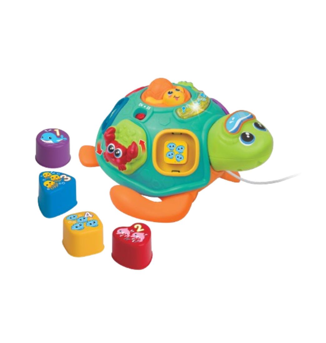 Tortuga de clasificación de formas arrastrada con acción de hacer estallar bloques Clasifica las formas para obtener sonidos ligeros, divertidos y melodías. Presiona la tortuga bebé giratoria para que las formas vuelvan a salir.