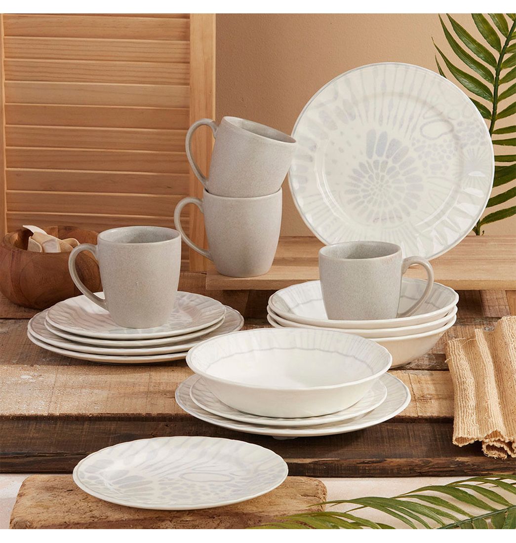 Incluye: 4 plato postre amonita 20 cm, 4 plato pando amonita 24,3 cm, 4 plato hondo amonita 691 ml, 4 mug esmalte concreto reactivo 379 ml.