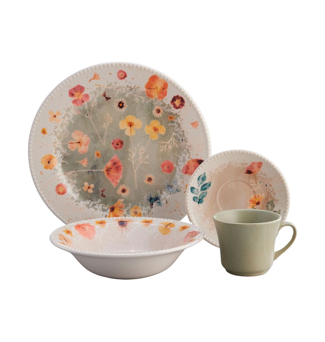 Incluye: 4 Platos de Té 15.1 cm, 4 Platos Pandos 27.6 cm, 4 Platos Hondos 540.6 ml y 4 Pocillos de Té 229 ml.