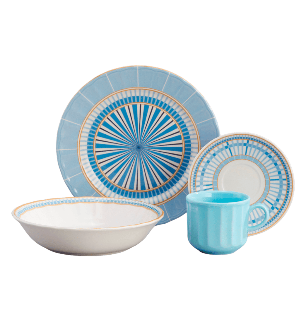 Incluye: 4 plato té azura 14.9 cm, 4 plato pando 24,2 cm azura, 4 plato hondo 691 ml azura, 4 pocillo té 260 ml color celeste.