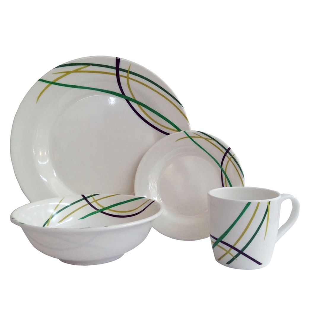 Vajilla en Melamina Clásica Blanca Líneas Verdes, Azules y Amarillas Redonda 16 Piezas 4 Puestos - Sabana