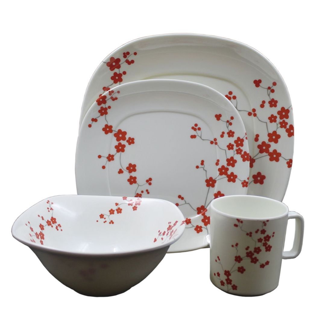 Vajilla en Melamina Imperial Blanca Flores Rojas Semi Cuadrada 16 Piezas 4 Puestos - Sabana